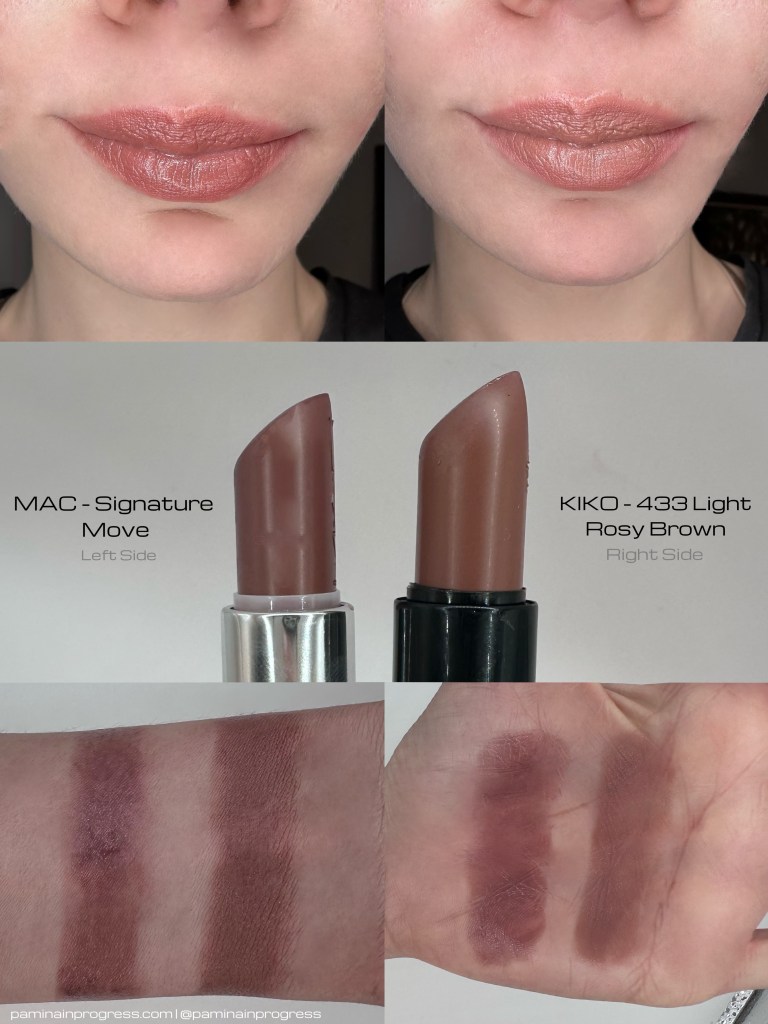 Kiko’s Smart Fusion Lipstick in shade 433 Light Rosy Brown was the first lipstick that came to mind when I was looking for a dupe. They are definitely about the same depth but Signature Move has more warmth. Kiko 433 is way more neutral, plus the formula is different, it’s not as sheer or glossy. The more I looked at Light Rosy Brown though I was like “something is telling me to compare it right next to Alone Time”