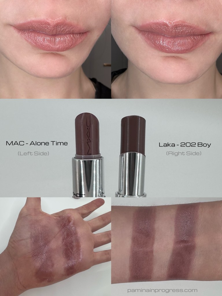 These are very close shades in my eyes. Laka is cooler and more pigmented, yes, but you can sheer it out. As far as I know it’s as close as you can get for a dupe. The price at most places seems to be around $16, the formula? Damn near the same. Seriously. If I am being picky, Mac’s lustreglass formula does have a bit more “slip”. It feels slightly more oily.