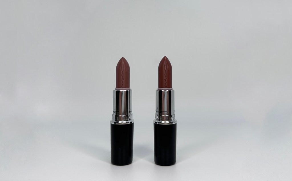 Both lipsticks are from MAC’s lustreglass lipstick line, and they are in that soft, muted neutral color family.